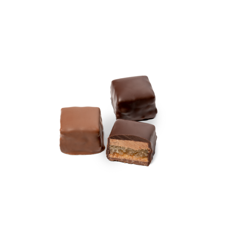 Schokoladenspezialität mit im Kirsch getränktem Biskuit, zartschmelzender Truffesmasse, knusprigem Haselnussboden und aromatischem Schokoladenüberzug in dunkler und Milchschokolade. Enthält Alkohol.