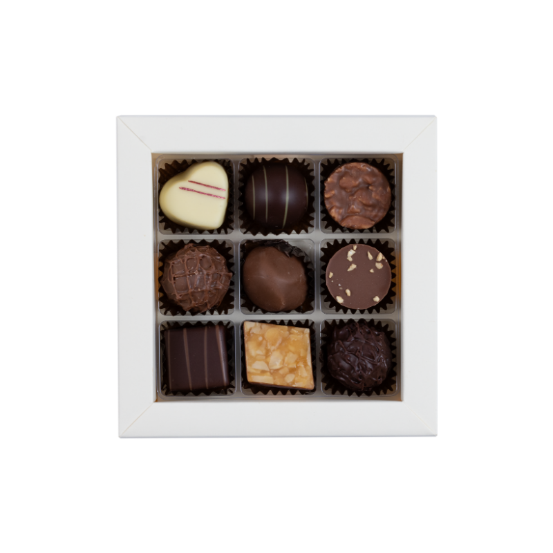 Schachtel mit Herz-Cutout gefüllt mit 9 ausgewählten Pralinés & Truffes.