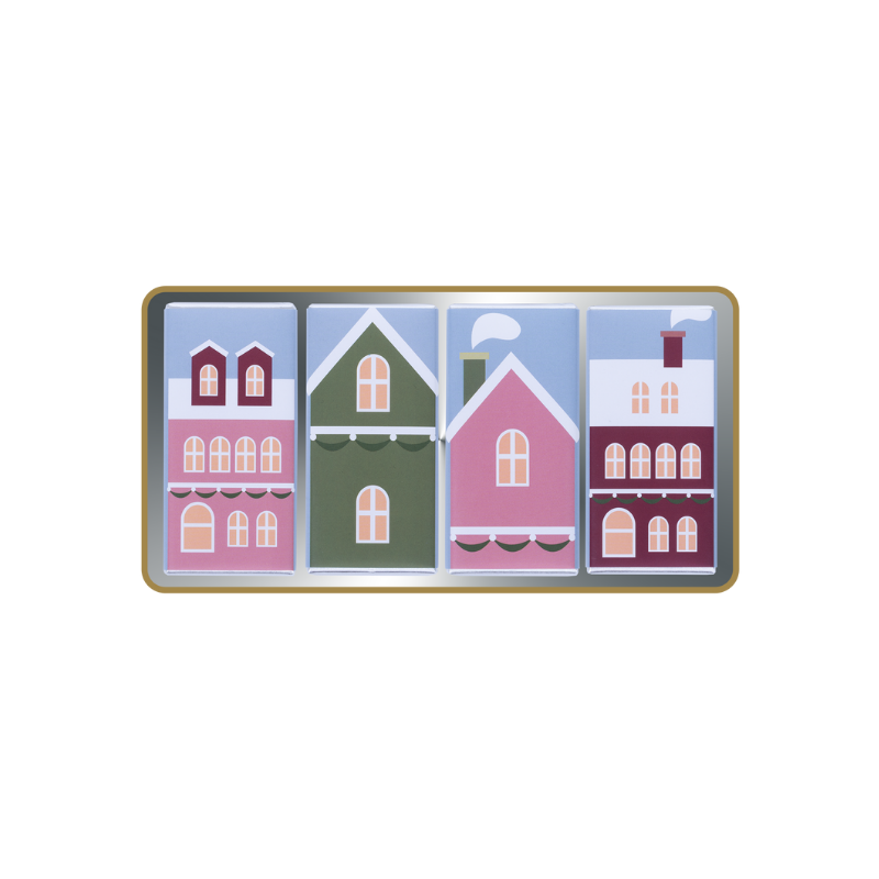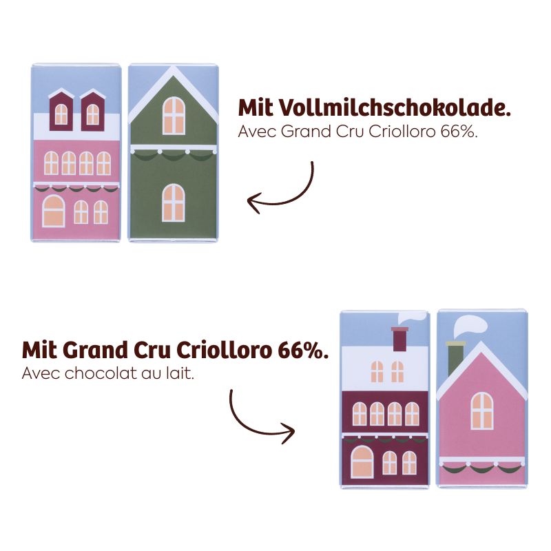 Weihnachtliche Metalldose mit 30g Lunches aus Milchschokolade und Grand Cru Criolloro 66%.