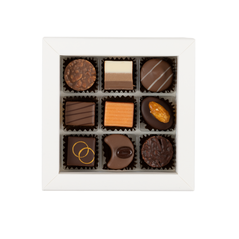 Schachtel gefüllt mit 9 ausgewählten Pralinés & Truffes.
